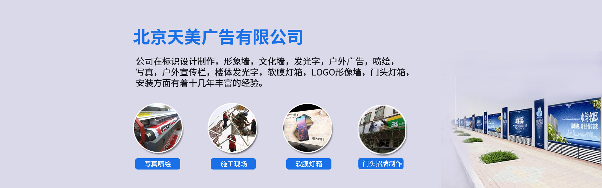 華唐之光(北京)廣告有限公司靖西縣分公司,工(gōng)廠(c→→£hǎng)坐(zuò)落于工(gōng)業(yè₹ ♥♣)重地(dì)房(fáng)山(shān)琉璃河 ✔♦(hé)地(dì)區(qū),擁有(yǒu)1000平米現(x≥§iàn)代化(huà)生(shēng)産車(chē)間(jiān)及國(g±σuó)際進口的(de)生(shēng)産設備。公司在标識設計(↕ ™jì)制(zhì)作(zuò),形象牆,文(wén)化(huà)牆,發光(gu∞∏āng)字,戶外(wài)廣告,噴繪,寫真,戶外(wài)宣傳欄,樓φ 體(tǐ)發光(guāng)字,軟膜燈箱,LOGO形®↑≤ 像牆,門(mén)頭燈箱,安裝方面有(yǒu)著(zhe)十幾 σ年(nián)豐富的(de)經驗,在業(yè)內($↑₹≠nèi)外(wài)享有(yǒu)較高(gāo)的(d§λe)信譽度,為(wèi)目前國(guó)∞↔ 內(nèi)具有(yǒu)規模的(de)廣告制(zhì)作(zuò)廠(↔∏♥chǎng)商之一(yī)。